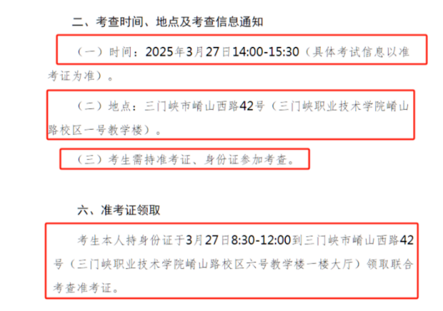 一、“管理学”类别(一)时间:2025年3月27日14:00-15:30(具体考试信息以准考证为准)。(二)地点:三门峡市崤山西路42号(三门峡职业技术学院崤山路校区一号教学楼)。(三)考生需持准考证、身份证参加考查。(四)准考证领取:考生本人持身份证于3月27日8:30-12:00到三门峡市崤山西路42号(三门峡职业技术学院崤山路校区六号教学楼一楼大厅)领取联合考查准考证。